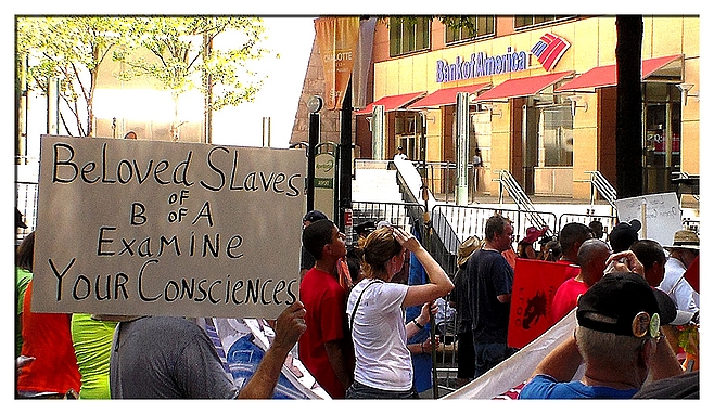 Signs, signs everywhere signs. It is important to find ones that say something. Marchers protesting outside Bank of America in Charlotte during the 2012 Democratic Convention. by