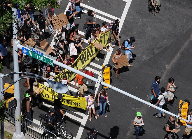 Protester march just outside of the security perimeter in Tampa for the RNC by