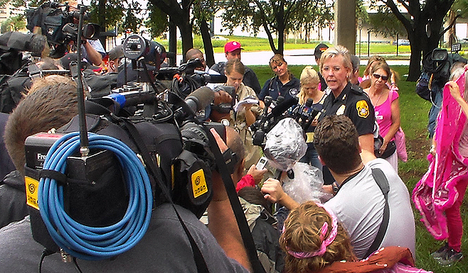 Tampa Police Chief Jane Castor speaks to media prior to a protest march at the Republican National Convention by Mickey Osterreicher