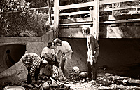 A small wooded bridge spans the concrete storm wash where the activities take place. Looking to the right as you pass you get your first glimpse of the "the tube" bisecting the wash wall at a very acute angle that almost looks intentional by design. No crowd, some interested and concerned locals looming.