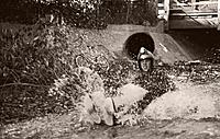 It's fast...Really fast! You can feel the sharp turns and steep drops as you descend. You get air! To this day I'd swear I did a couple of 360's. I thought I had my eyes closed but I did see the circle of light at the end. Seconds later I was hydroplaning across the open storm channel. It felt like getting thrown through the air and skimming like a rock in a pond. I hit the bank on the other side and came to a stop in a sunny spot. All I could do was lie there and laugh...My heart was beating fast and I was a soapy muddy mess.