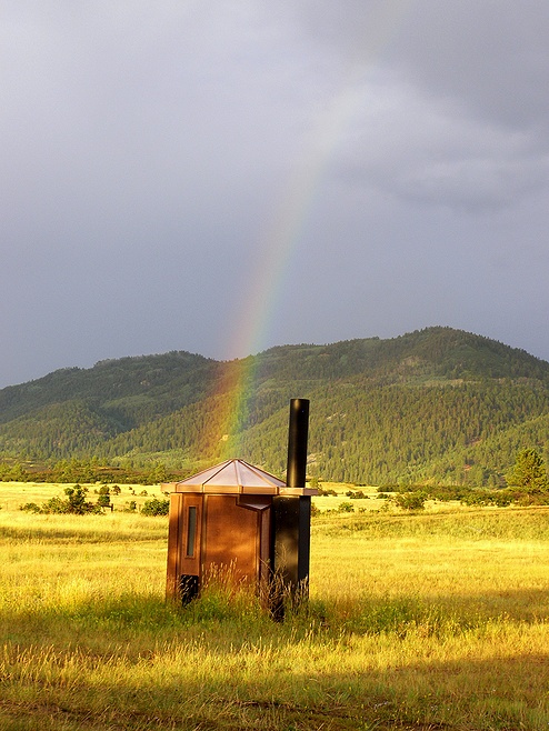 A rainbow over the outhouse in Chama New Mexico.
