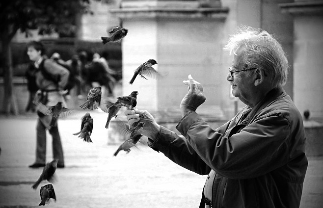 this is a brilliant take on the "cliche" of bird feeding. the arrangement of the birds, and the hand gesture of the old fella, combined with the glint in his eye... makes me feel as though he's "composing" the birds like a symphony !