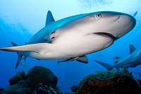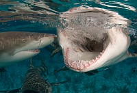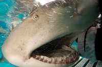 Orienting quickly, I scanned the endless blue for Tiger sharks. The other eight divers were doing the same, cameras in hand, heads rotating slowly and steadily on their neoprene-covered necks. Though I kept glancing behind me, I knew a Tiger would come from my right, cruising upstream towards the fishy scent of the frozen chum-cicle the dive master was shaking patiently in the water. I waited quietly, upstream of the crate of melting fish guts. I took some practice shots of my fin, to confirm my camera's settings were correct. I squeezed off some shots of the Lemons circling my feet. I glanced around some more.